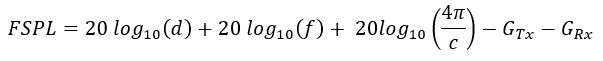 FSPL(dB) = 20 × log10(d) + 20 × log10(f) + 92,45 − Gtx − Grx