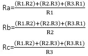 Ces équations permettent de passer d’un réseau étoile à un réseau triangle en calculant chaque résistance équivalente. R1, R2 et R3 représentent les résistances dans la configuration étoile, tandis que Ra, Rb et Rc sont les résistances correspondantes dans la configuration triangle. Ce calcul garantit que les caractéristiques électriques du réseau restent équivalentes après conversion.